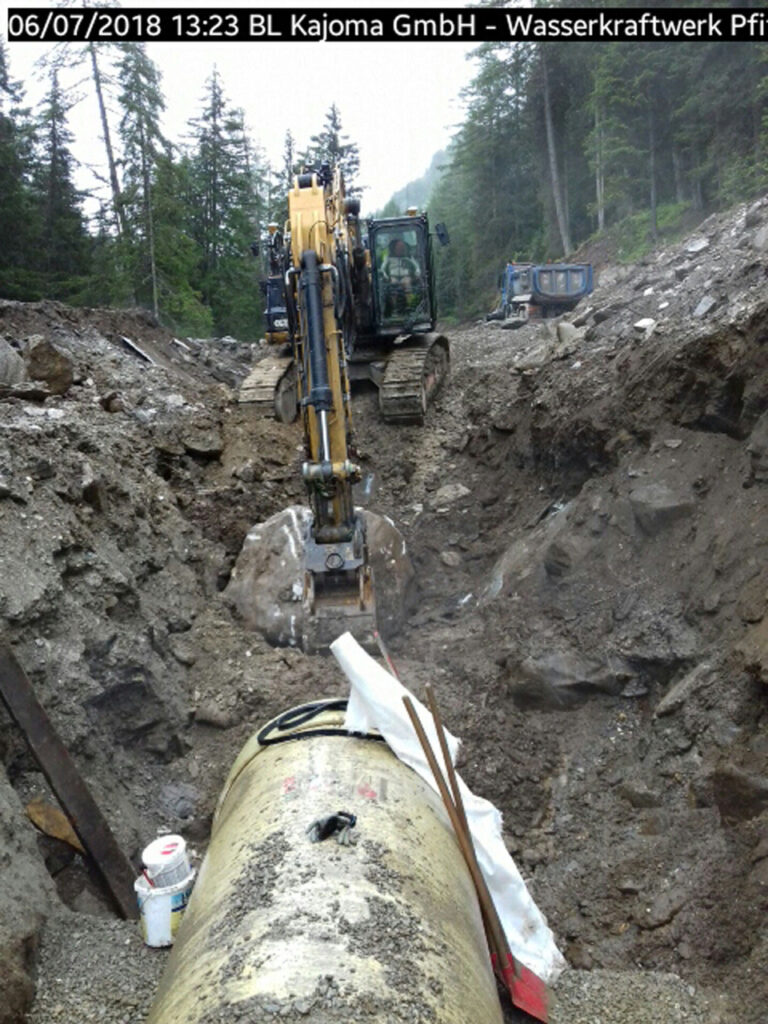 Im Zuge eines Ausbaus des Wasserkraftwerks wurden zwei GFK-Druckrohrleitungen mit Ø1300 mm (PN10) und Ø1400 mm (PN6) über jeweils 325 Meter Länge verlegt – ein wichtiger Beitrag zur effizienten Energiegewinnung und Infrastruktur.