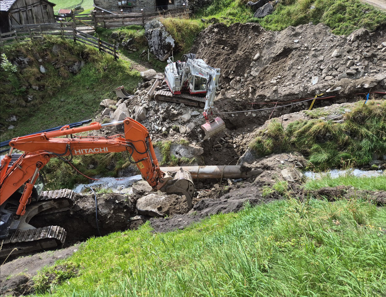 Wir verlegen Infrastrukturleitungen für Wasser, Gas, Strom und Daten – inklusive Spezialtechnik. Auch Bewässerungsanlagen, Quellfassungen und Druckrohrleitungen für Kraftwerke gehören dazu.